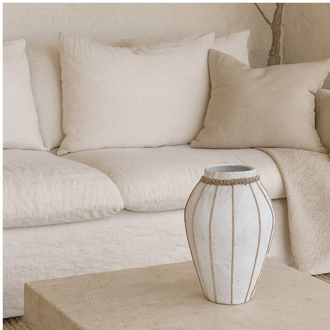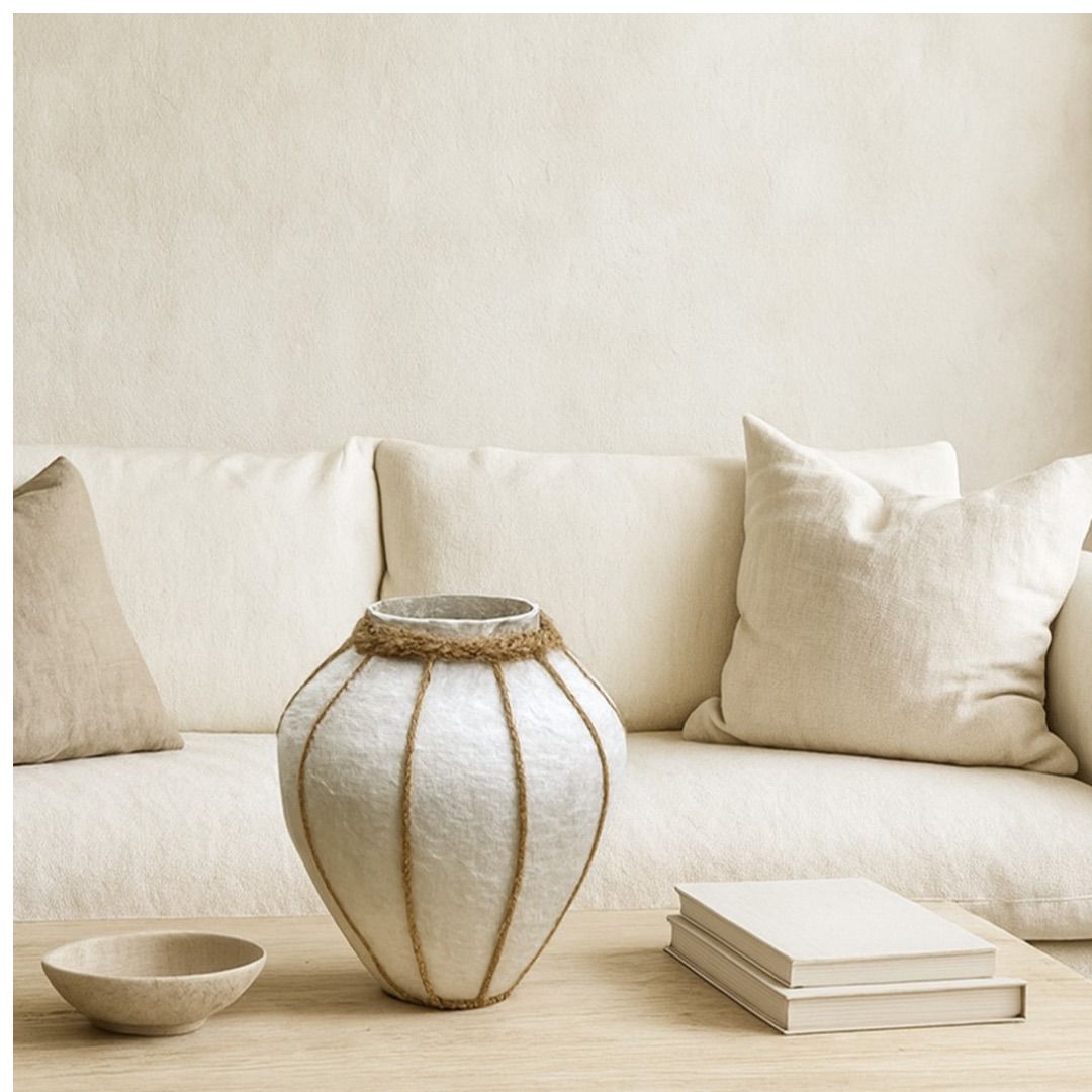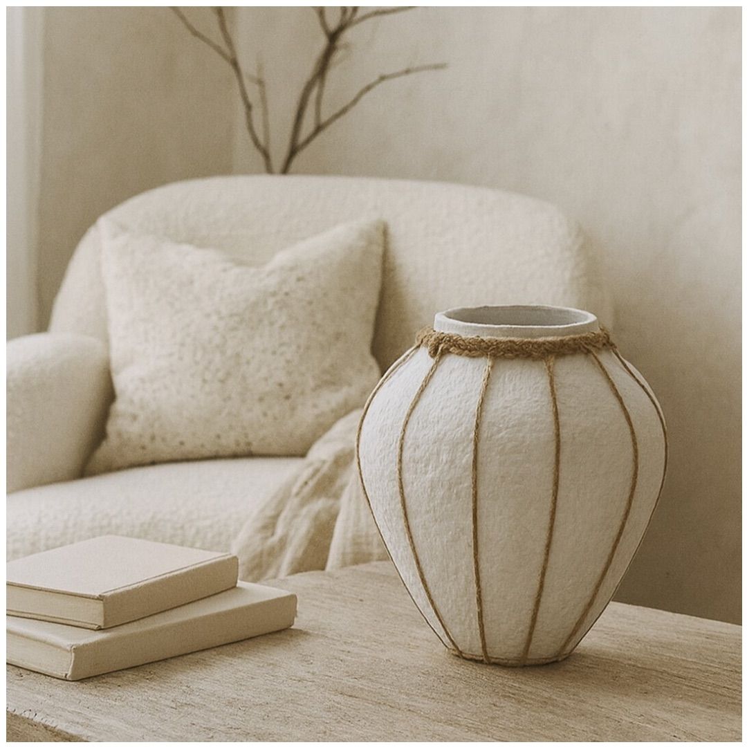Jarrones artesanales de tela maché en tonos naturales, con delicados detalles de cuerda que realzan su silueta orgánica.