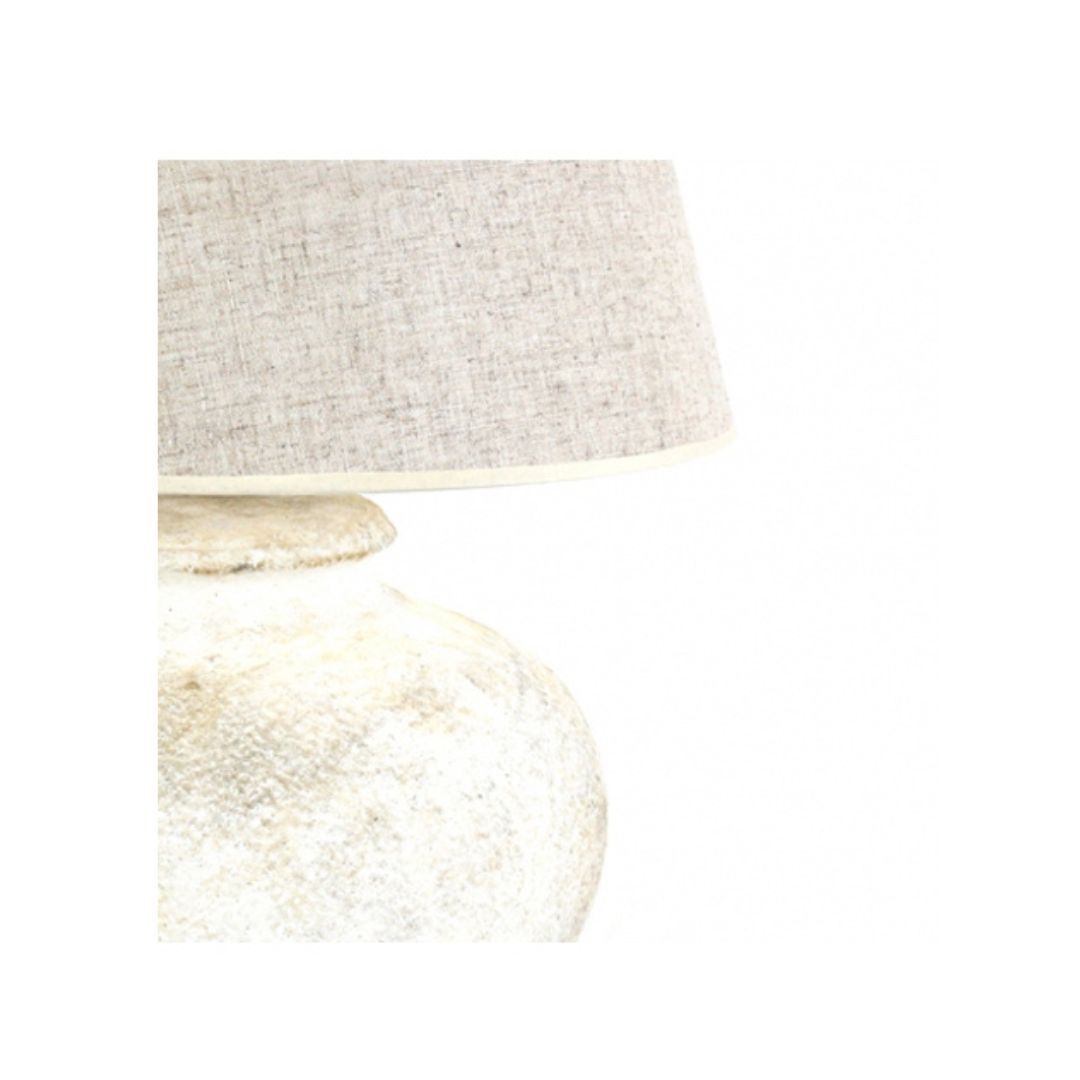 Su base de textura natural y forma orgánica se combina con una pantalla de lino claro, creando un diseño equilibrado y sofisticado.