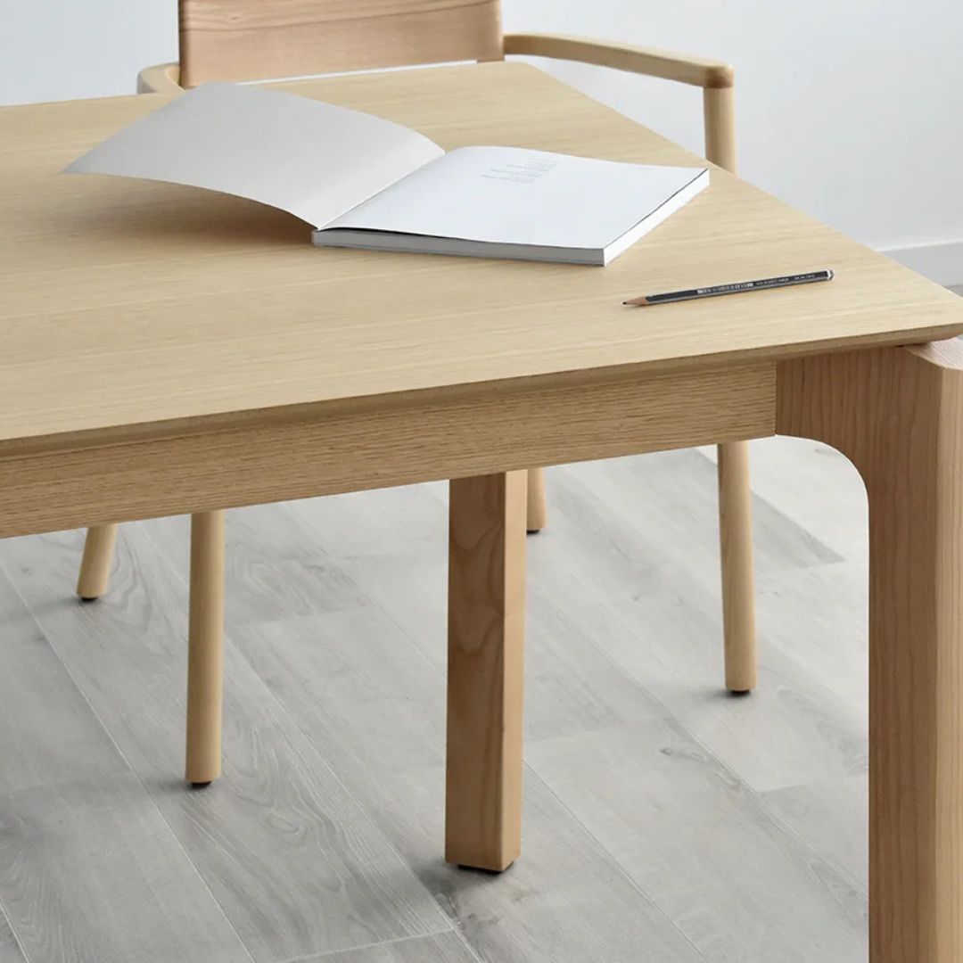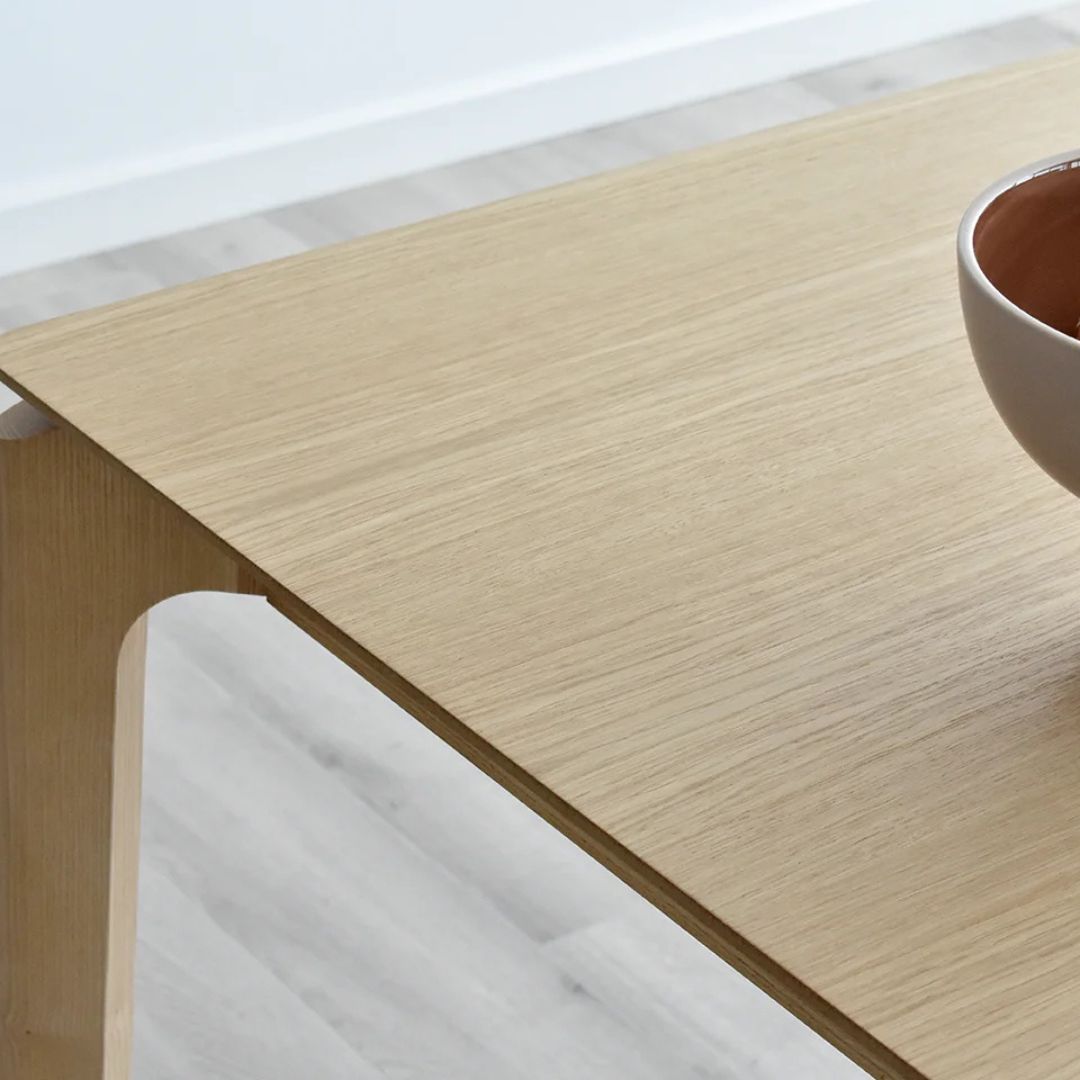Mesa de comedor extensible en color roble natural, de diseño elegante y líneas depuradas.