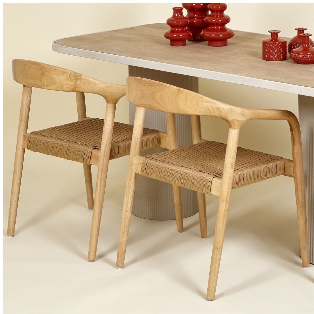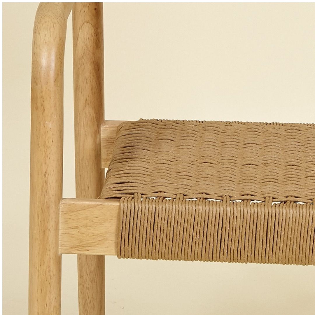 El asiento de fibra natural trenzada añade textura, ligereza visual y un toque artesanal que realza su belleza.
