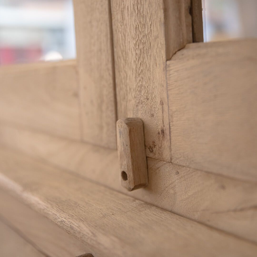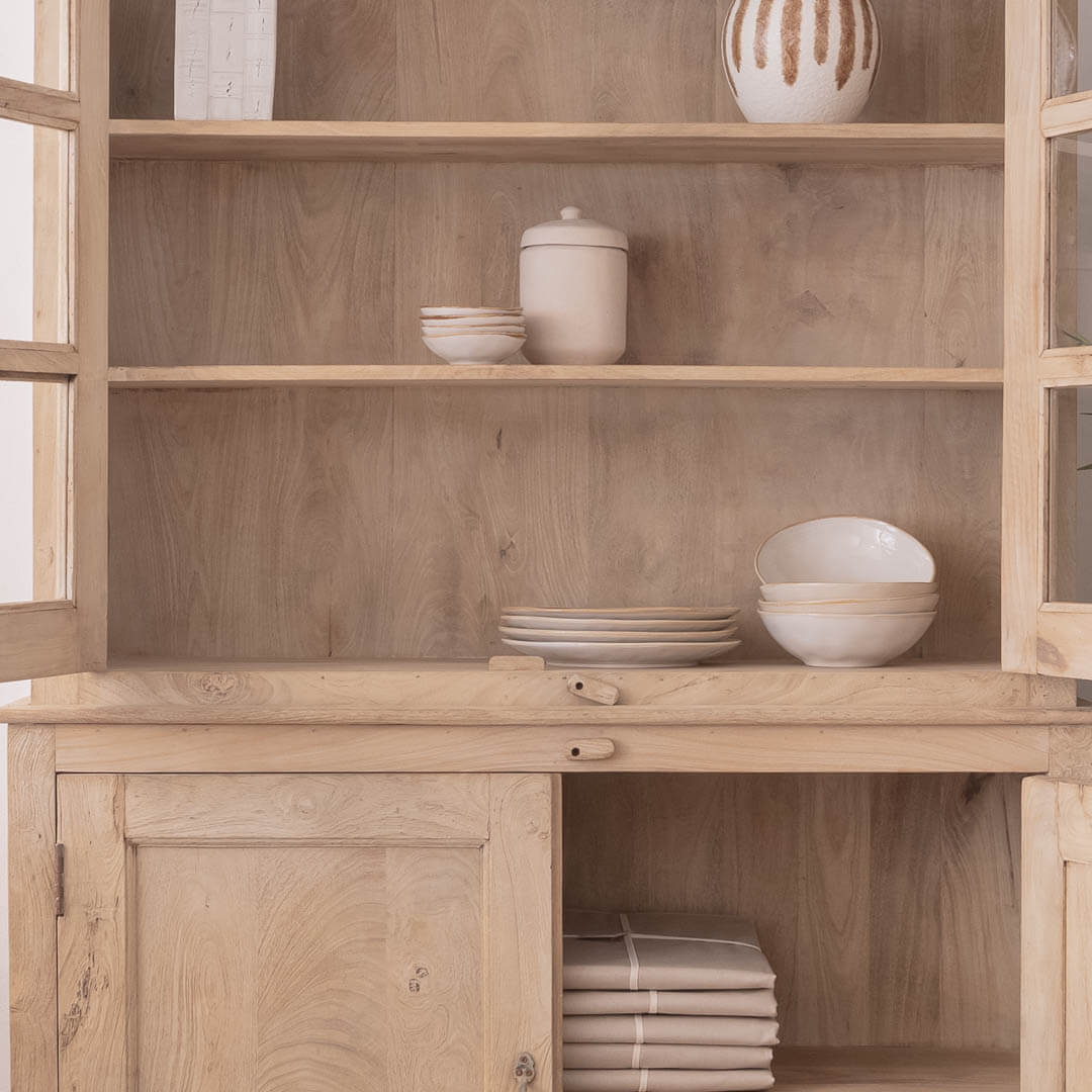 Esta vitrina de madera natural realizada de forma completamente artesanal, es un mueble de almacenaje de marcado estilo y delicadas líneas, que además de práctico y funcional, va a dar un toque único de elegancia y robustez a tu zona comedor.